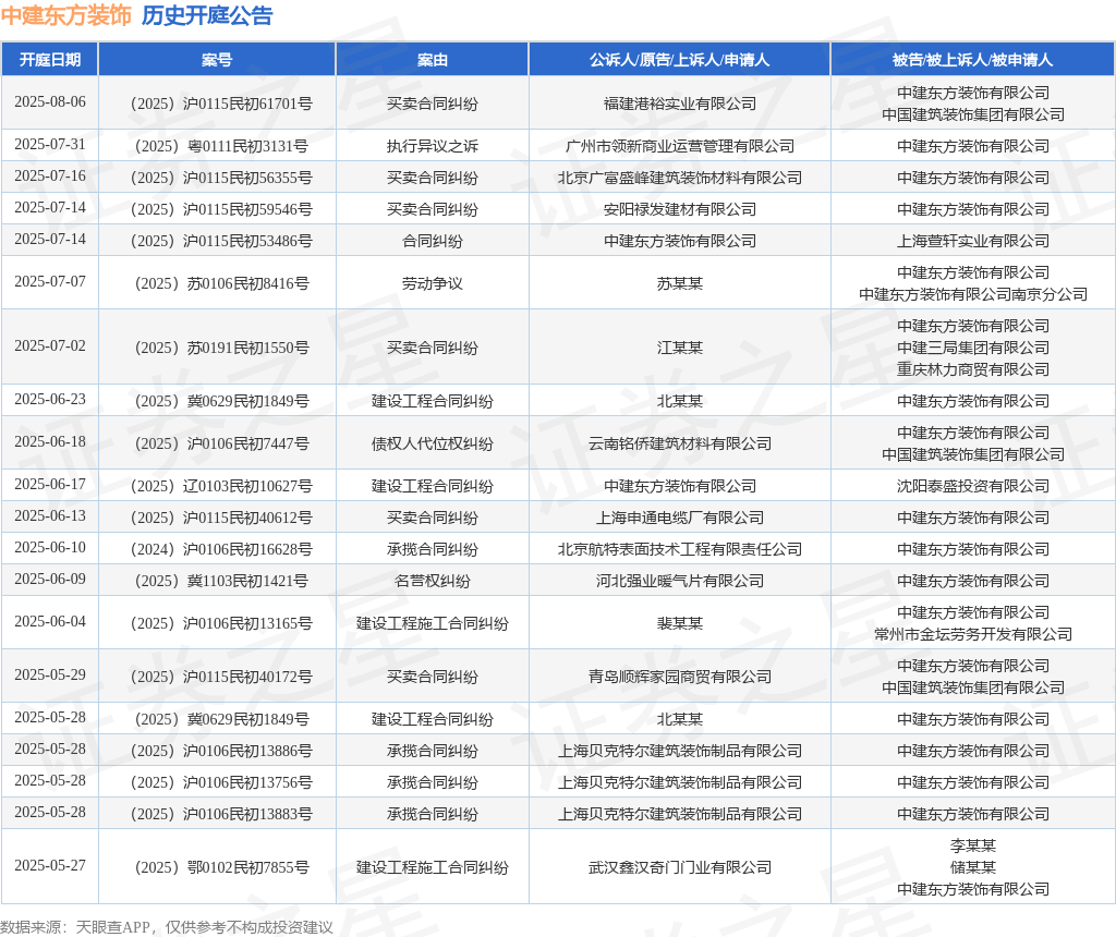 根据统计,近一年内以中建东方装饰有限公司为当事人的历史开庭公告有186则,其中案由为“买卖合同纠纷”的公告以64则居首,其次为“承揽合同纠纷”有38则,“建设工程施工合同纠纷”有22则。历史开庭公告(前20条)如下: