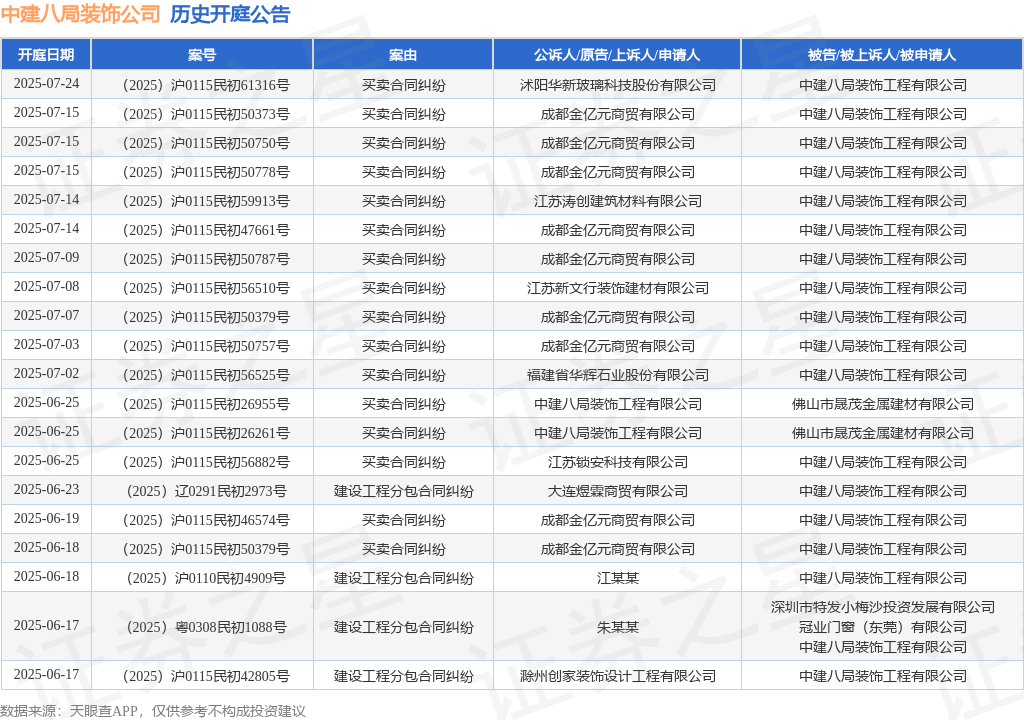 根据统计,近一年内以中建八局装饰工程有限公司为当事人的历史开庭公告有355则,其中案由为“买卖合同纠纷”的公告以262则居首,其次为“建设工程分包合同纠纷”有14则,“建设工程施工合同纠纷”有12则。历史开庭公告(前20条)如下: