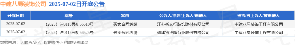 恩佐2-恩佐2注册恩佐2登录-首页主管QQ83670629--恒盛注册证券之星消息,根据天眼查APP显示,恒盛娱乐注册近日公布了2则中建八局装饰工程有限公司作为被告/被上诉人的开庭公告,案由为买卖合同纠纷,开庭日期为2025年7月2日。详细内容如下: