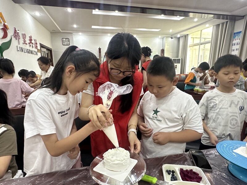 来自“青鸟计划”的五名志愿者全程参与协助,他们提前学习了基础裱花手法,活动中耐心指导孩子们操作。志愿者们手把手地教,孩子们认真地学。有的孩子小心翼翼地用奶油在蛋糕胚上“绘画”,有的则专注地将各色水果组合成独特造型,现场不时响起阵阵欢呼。