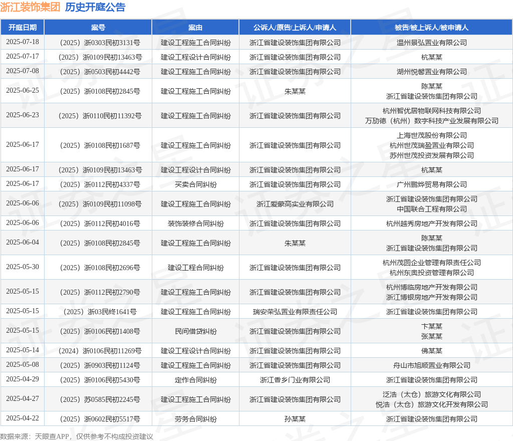 根据统计,近一年内以浙江省建设装饰集团有限公司为当事人的历史开庭公告有87则,其中案由为“建设工程施工合同纠纷”的公告以32则居首,其次为“买卖合同恒盛娱乐纠纷”有15则,“建设工程分包合同纠纷”有10则。历史开庭公告(前20条)如下: